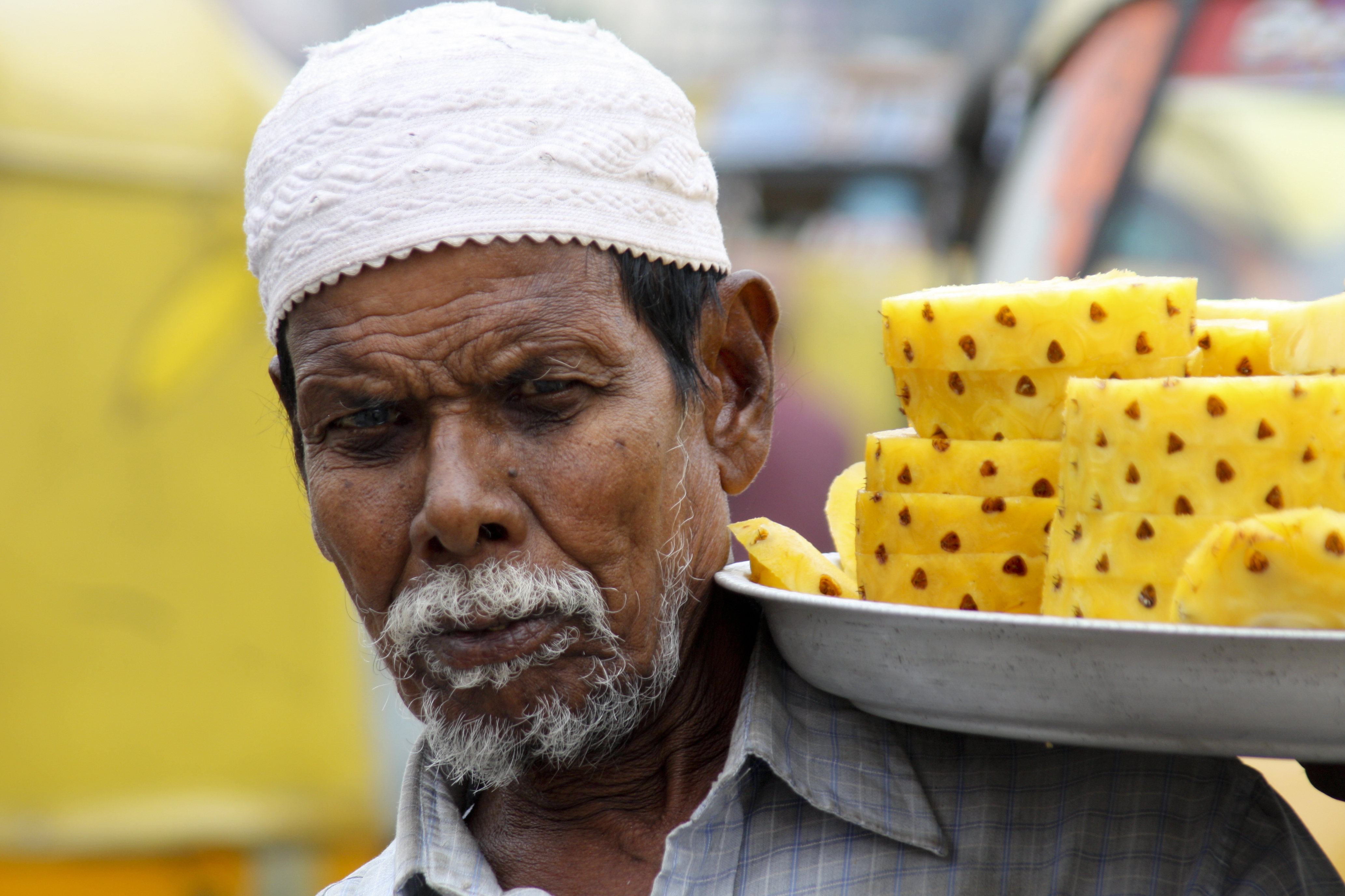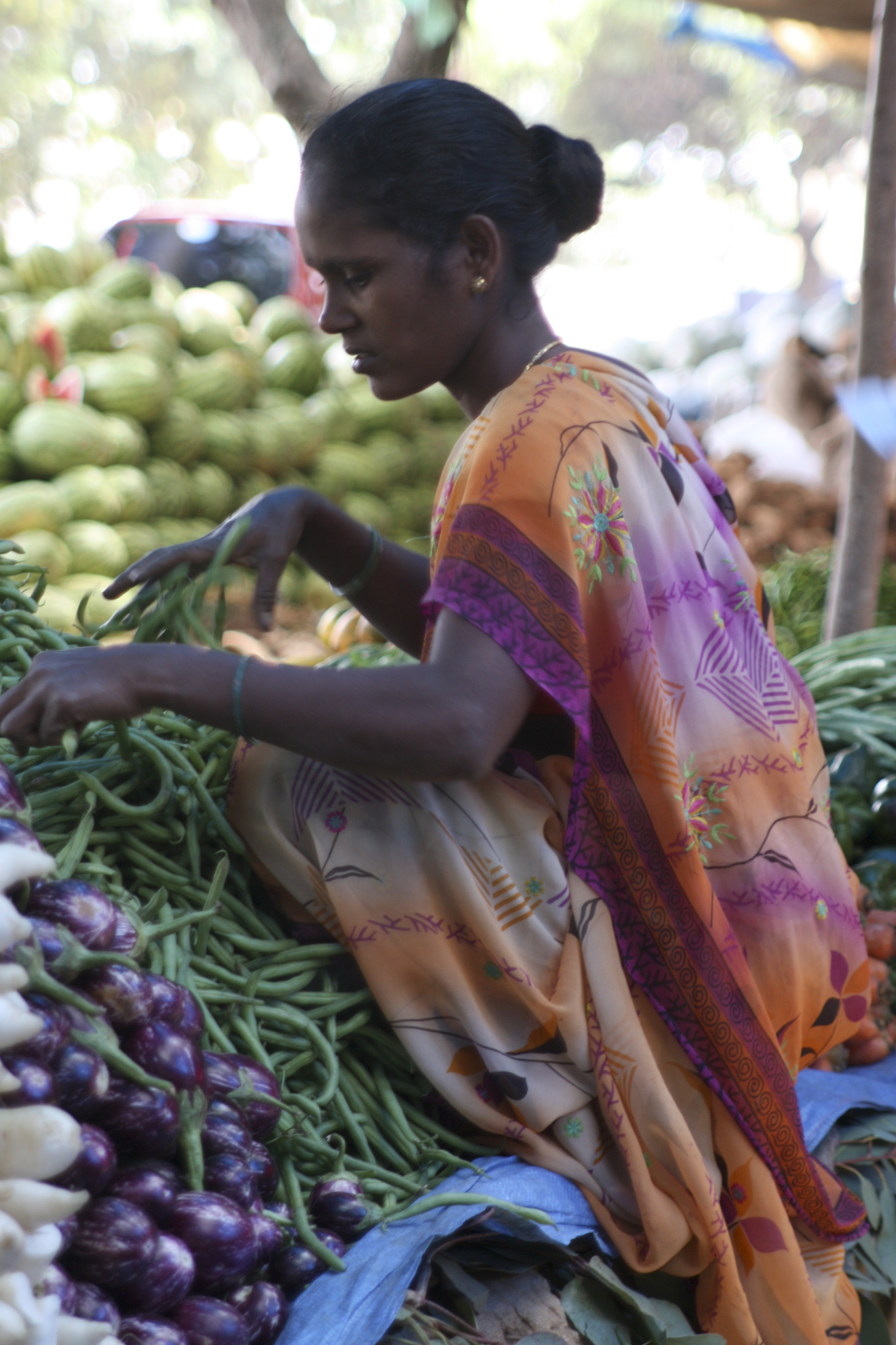 Visiting the market at Bangalore, armed with camera and a selection of lens I positioned myself discreetly in the corner of the market at an advantage point. I observed a vendor taking a few brief moments from her busy day, her pensive look was deep and I could not help but wonder what she was contemplating. The moment was interrupted when a man strolled by carrying a tray of freshly prepared pineapple, the rugged expression of concentration and determination evident in each line of his face. As I strolled further round the market I watched with admiration the way that the customers extracted their chosen goods with precision and bartered the price to an acceptable level for both parties. We are far too quick to pay the asking price in the UK as bartering not being a tradition sported. However, with the economic challenges currently being suffered by many I have observed people asking for lower pricing, I wonder if this is due to people travelling and experiencing the fun of negotiating!