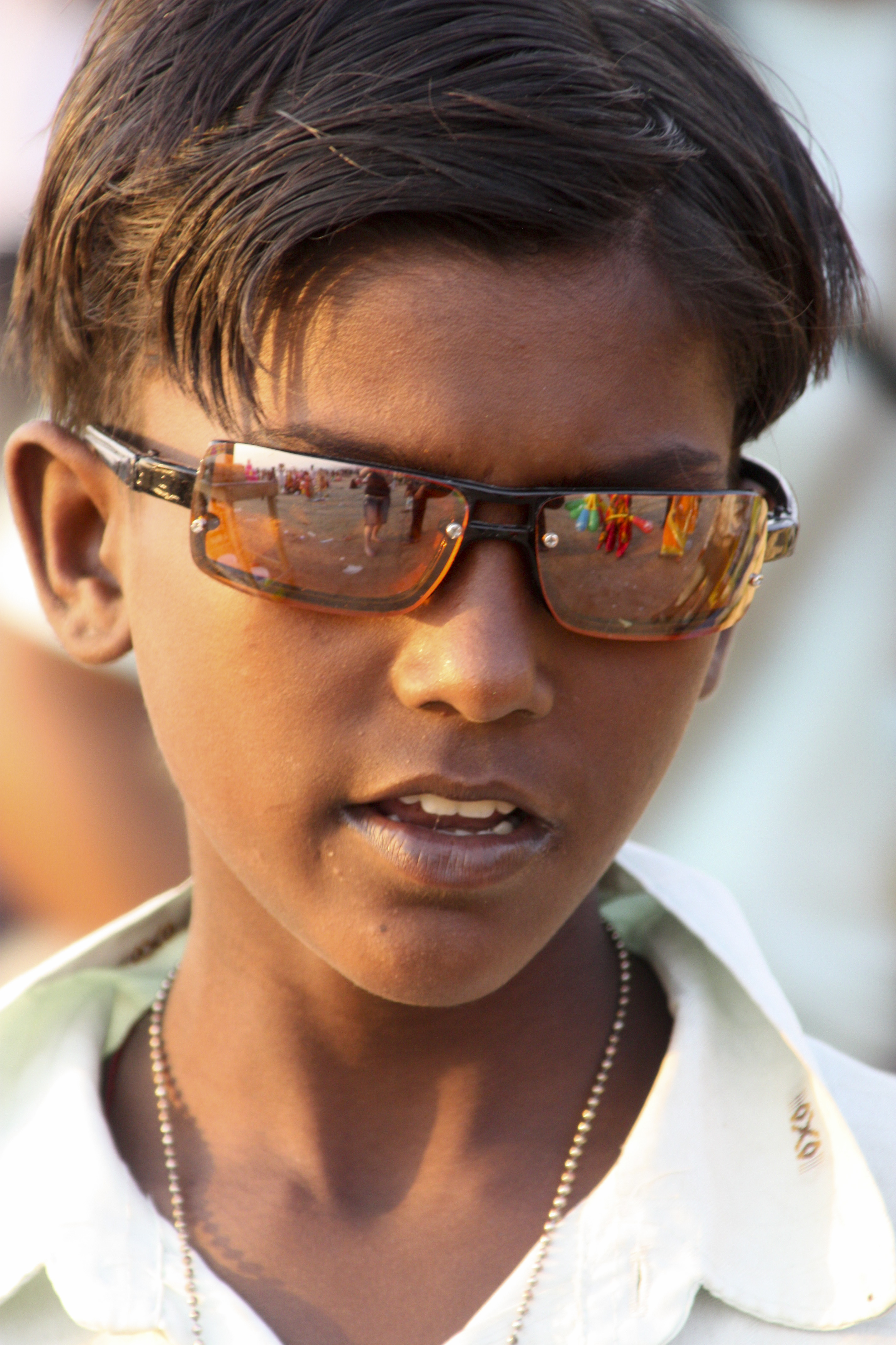 The young man wore his sunglasses with pride not aware that the reflections of the gaiety surrounding him were visual on his lens. So here I was capturing the atmosphere of this fun day using my camera lens by photographing the boys lens on his sunglasses……….. It was easy to find such emotions walking along the beach, a typical place for everyone to let their hair down and enjoy the freedom of merriment. Was I going to find the same emotions in the more remote regions of India or would some of the hardship that surrounded some of these people shadow their happiness and quell their high spirits?