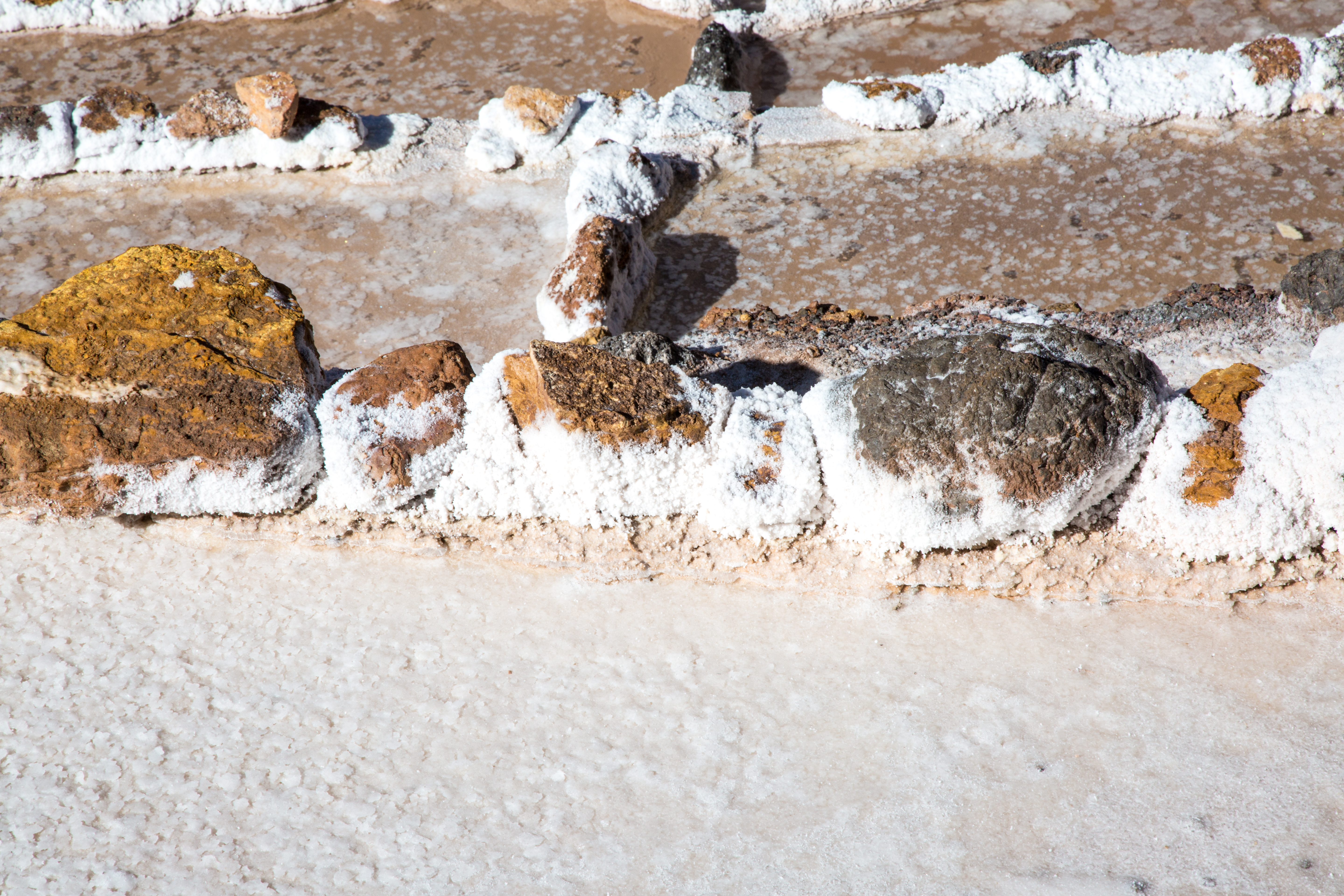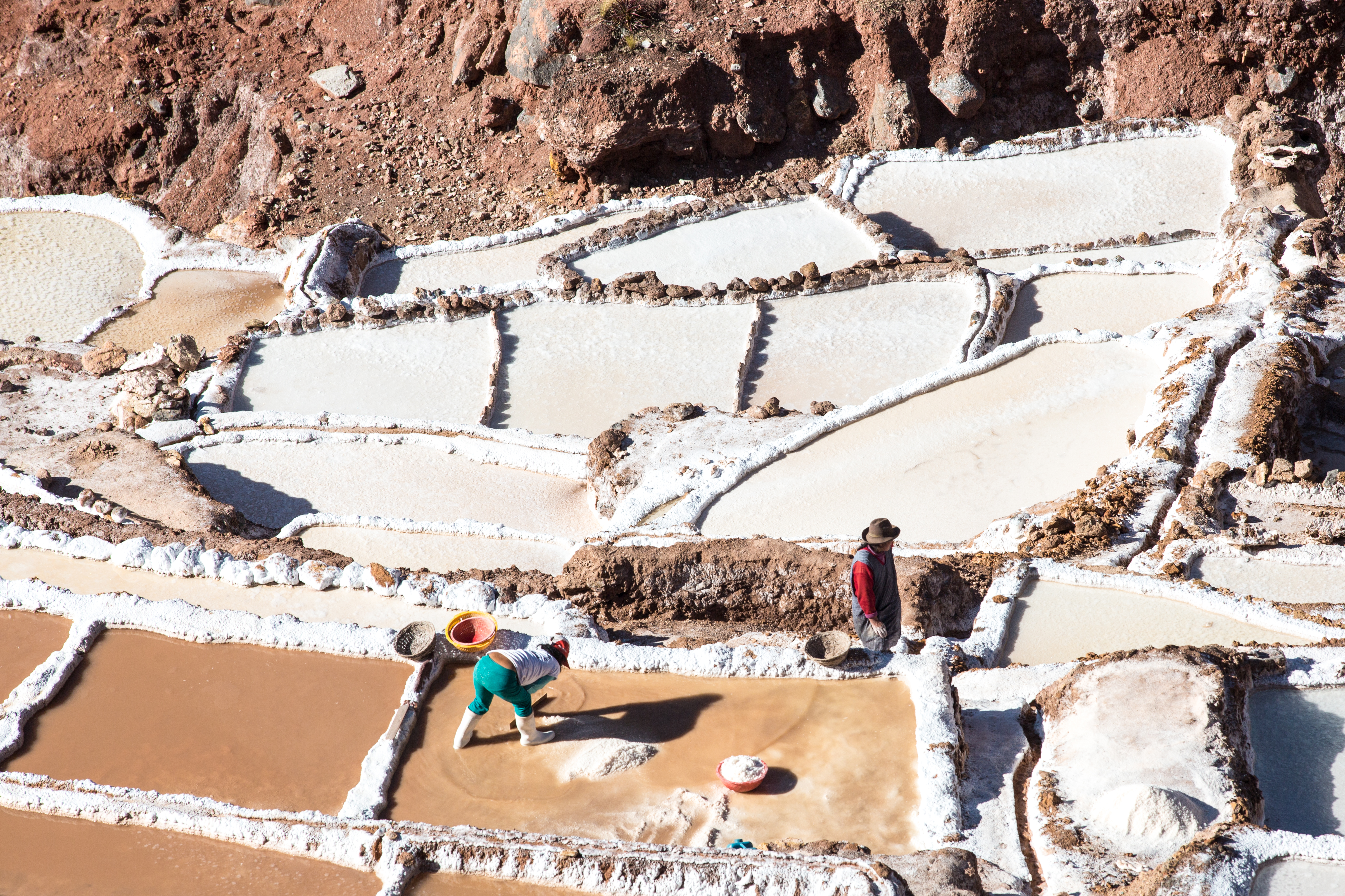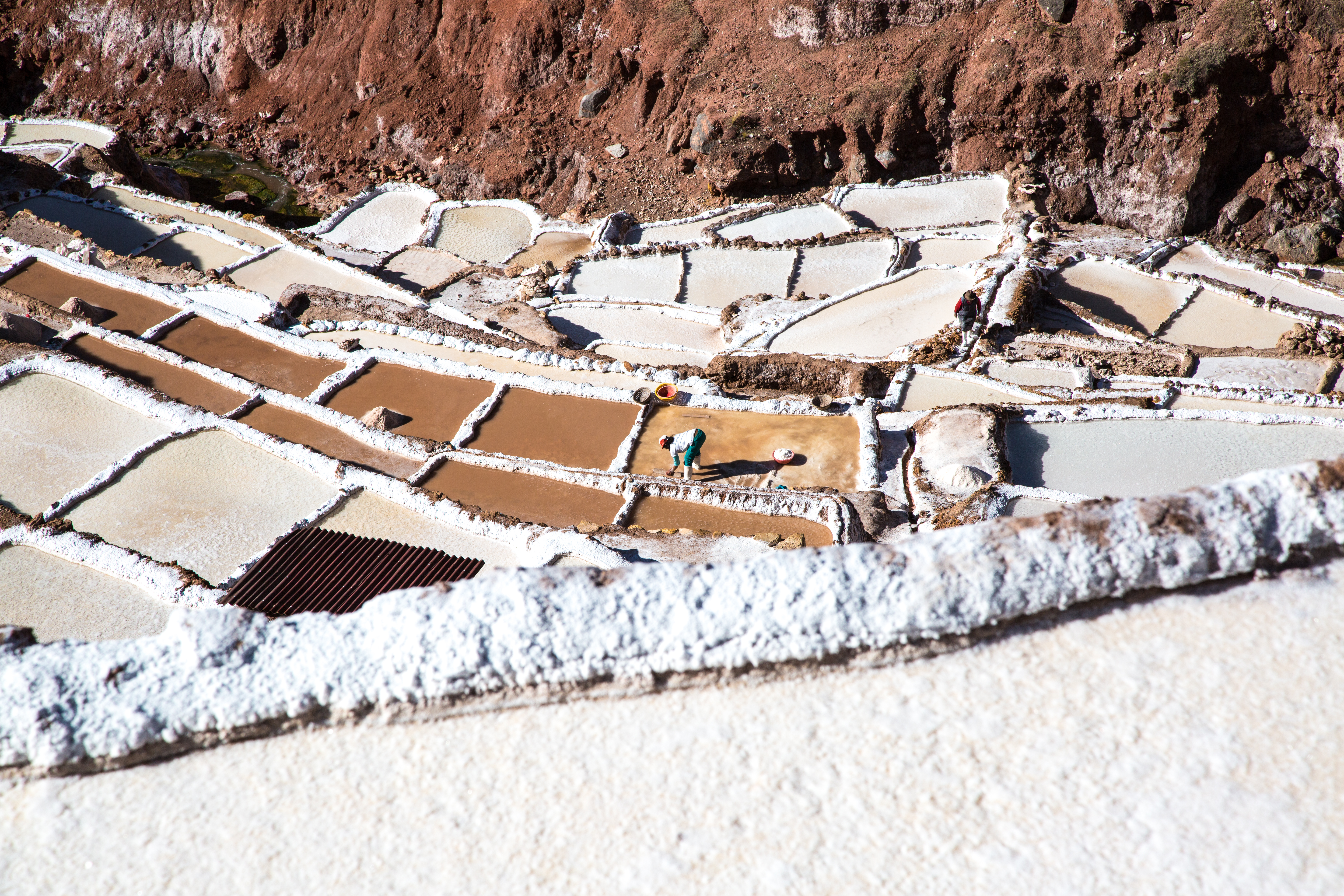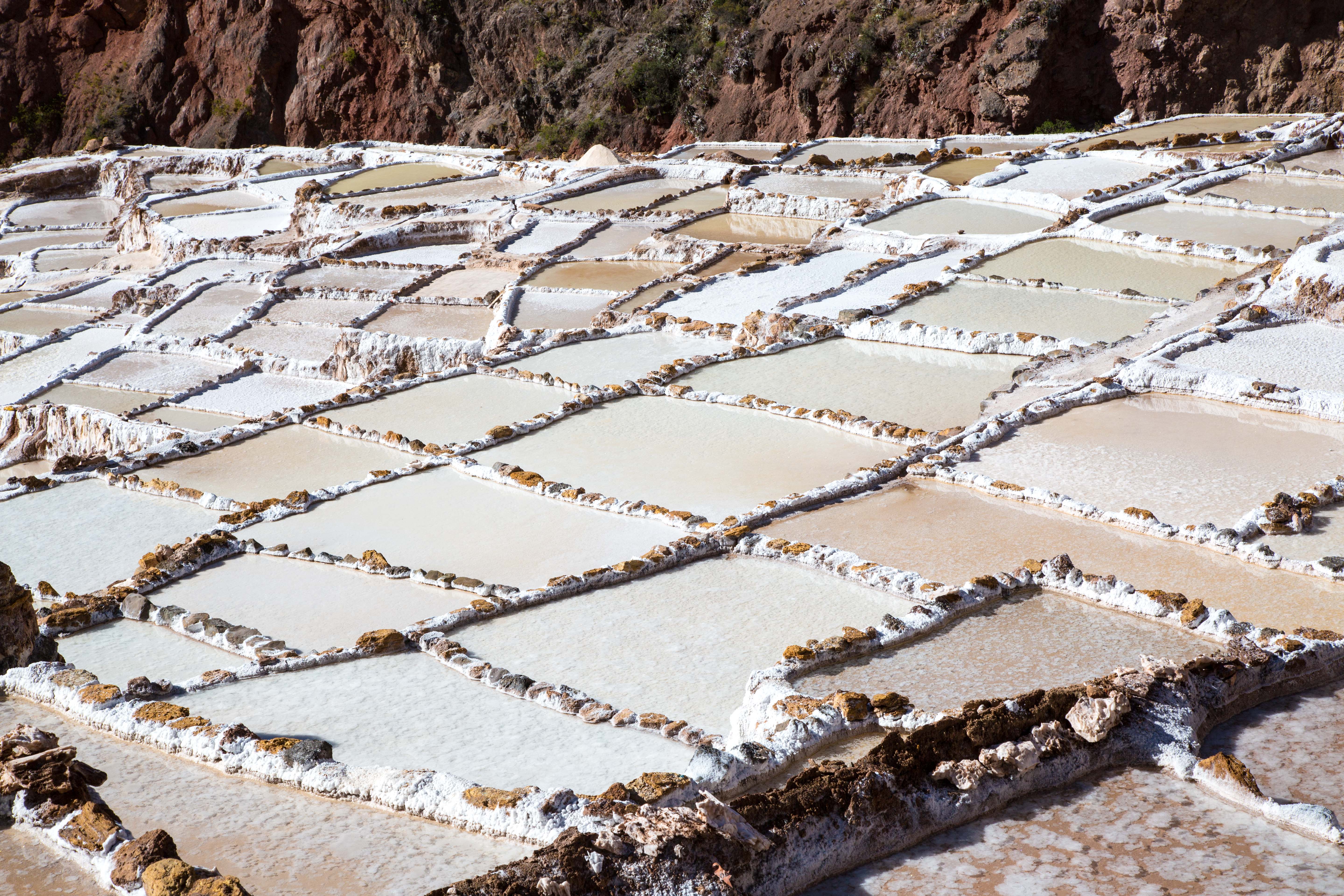 The Maras Salt Flats lie in the Scared Valley amongst the stunning Andes mountains. Who would have believed that you would come upon a mirage of salt flats in the mountains. The highly salty water emerges at a spring, a natural outlet of the underground stream. The flow is directed into an intricate system of tiny channels constructed so that the water runs gradually down onto the several hundred ancient terraced ponds. Almost all the ponds are less than four meters square in area, and none exceeds thirty centimeters in depth.