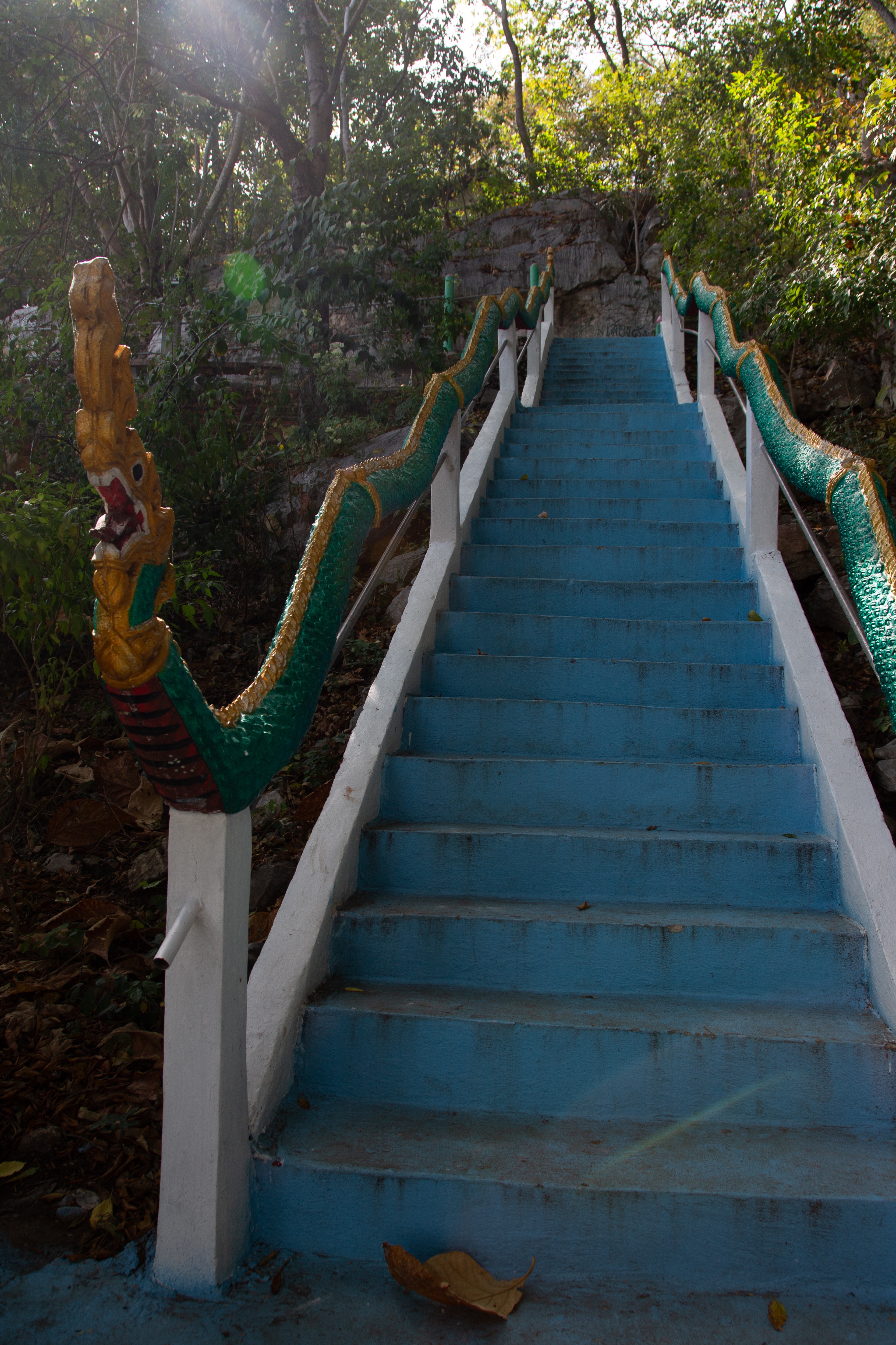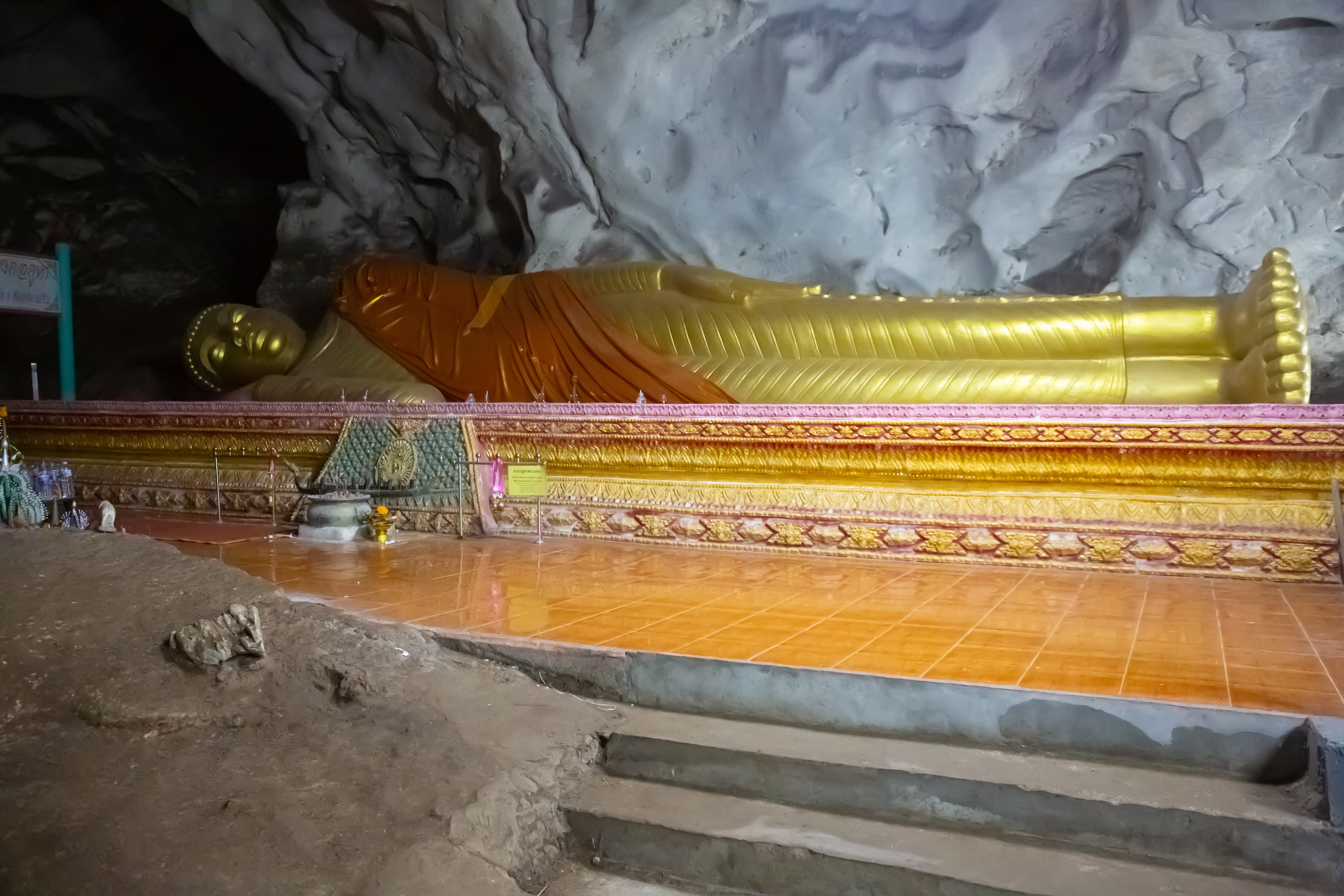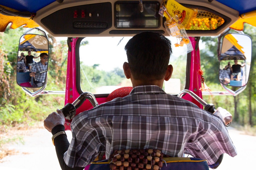 After a reasonable night’s sleep at the Hop Inn (very much like our Travel Lodges) we went to a mall very close to the hotel for breakfast. At this stage I have to say that the area we were in didn’t look too exciting. Directly across from the hotel was a theme park, not really for the mature traveller looking to experience the cultures of Thailand but fine for families. Next to the theme park was a grass park and lake where the locals would jog and exercise. We had a stroll so far round and decided it was too hot to walk far and decided to go back to the mall to get a tuk tuk to take us to a temple in a cave. The only available tuk tuk was a lovely elderly Thai gentleman that couldn’t speak a word of English and sadly we believe had difficulty reading. We used google translate but in the end showed him pictures of the temple on our phones. He offered to take us for THB300. We hadn’t realised how far this temple, Wat Tham Bo Ya was, almost 36 kilometres. If you have any aches or pains you may want to consider a taxi as this distance in a tuk tuk on a fast road is not the most comfortable mode of transport. Forget the movie Thelma and Louise by the time you arrive you are looking very wind swept. Unfortunately, or in this case fortunately, our wonderful driver managed to get lost, and we ended up in a remote Thai village in the middle of a jungle, a great experience as we were walking round while he asked every local, he could see where the temple was. Needless to say, we were several miles away. We hopped back into our not so luxurious tuk tuk and made our way to the correct area where he still had to stop several times asking locals if he was going in the right direction. We eventually arrived at the entrance of the temple grounds only to be faced with a very long steep staircase that leads to the entrance of the cave. Over 100 steps so if you have any disabilities that causes you problems with your legs you may want to give this temple a miss.
