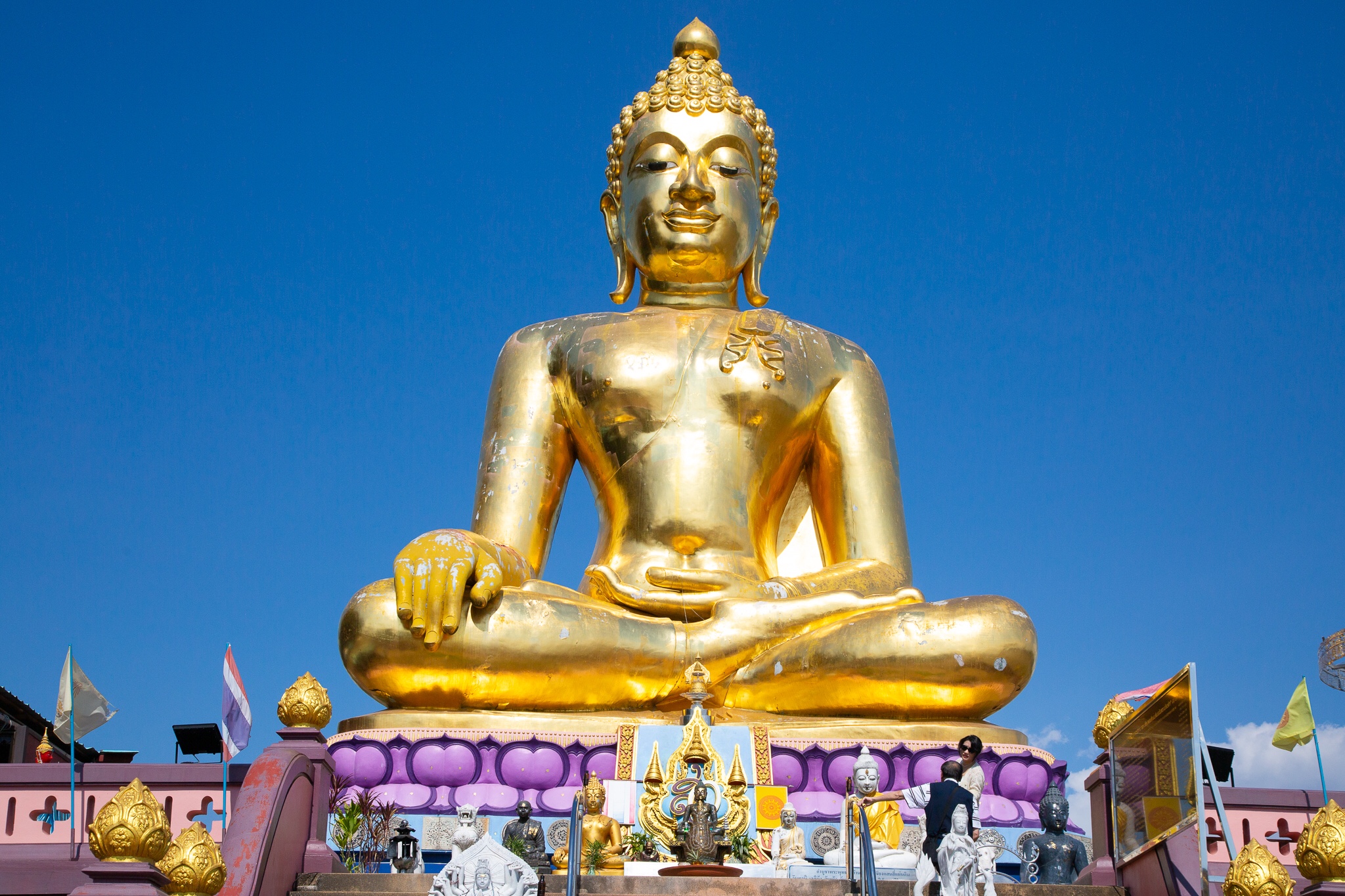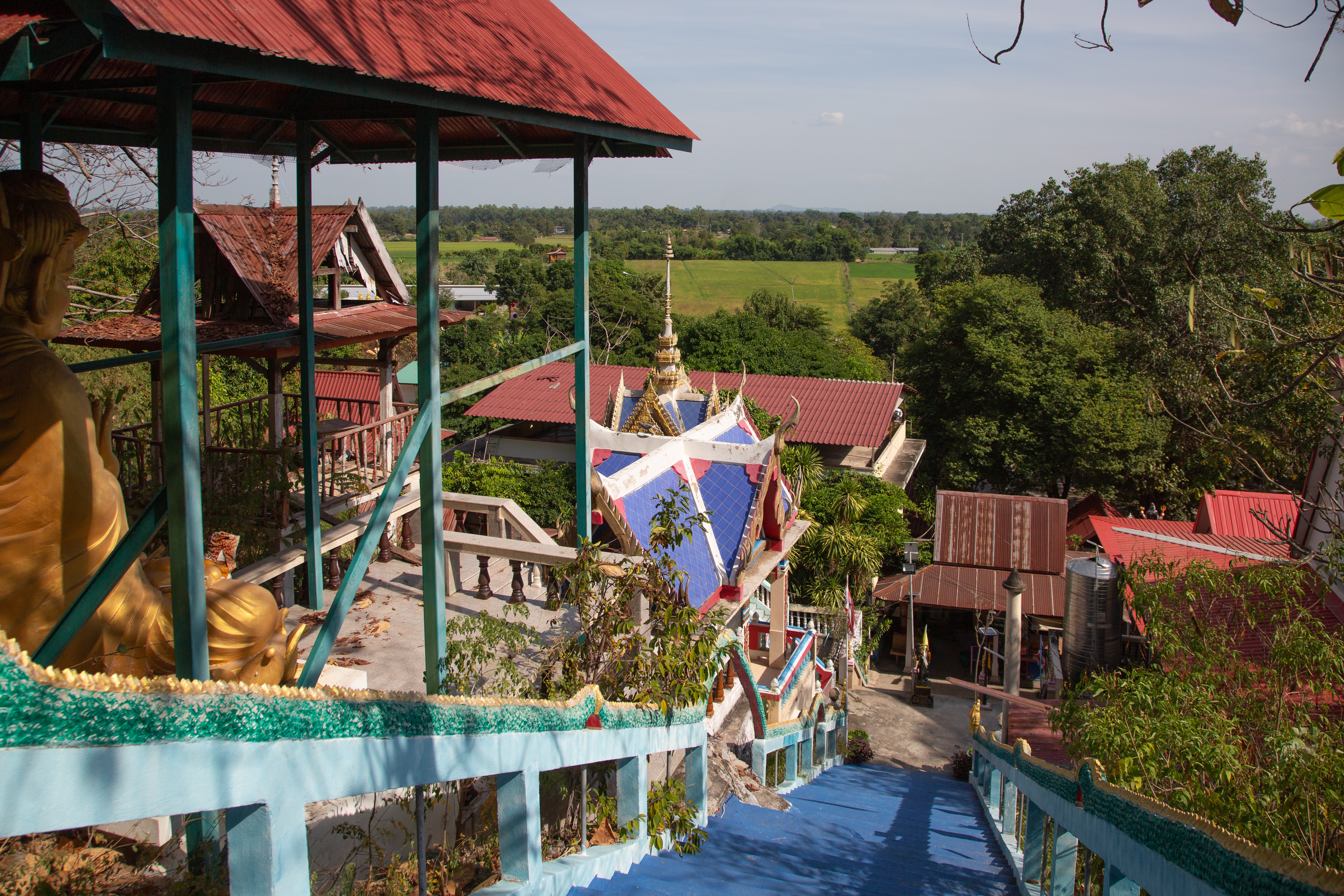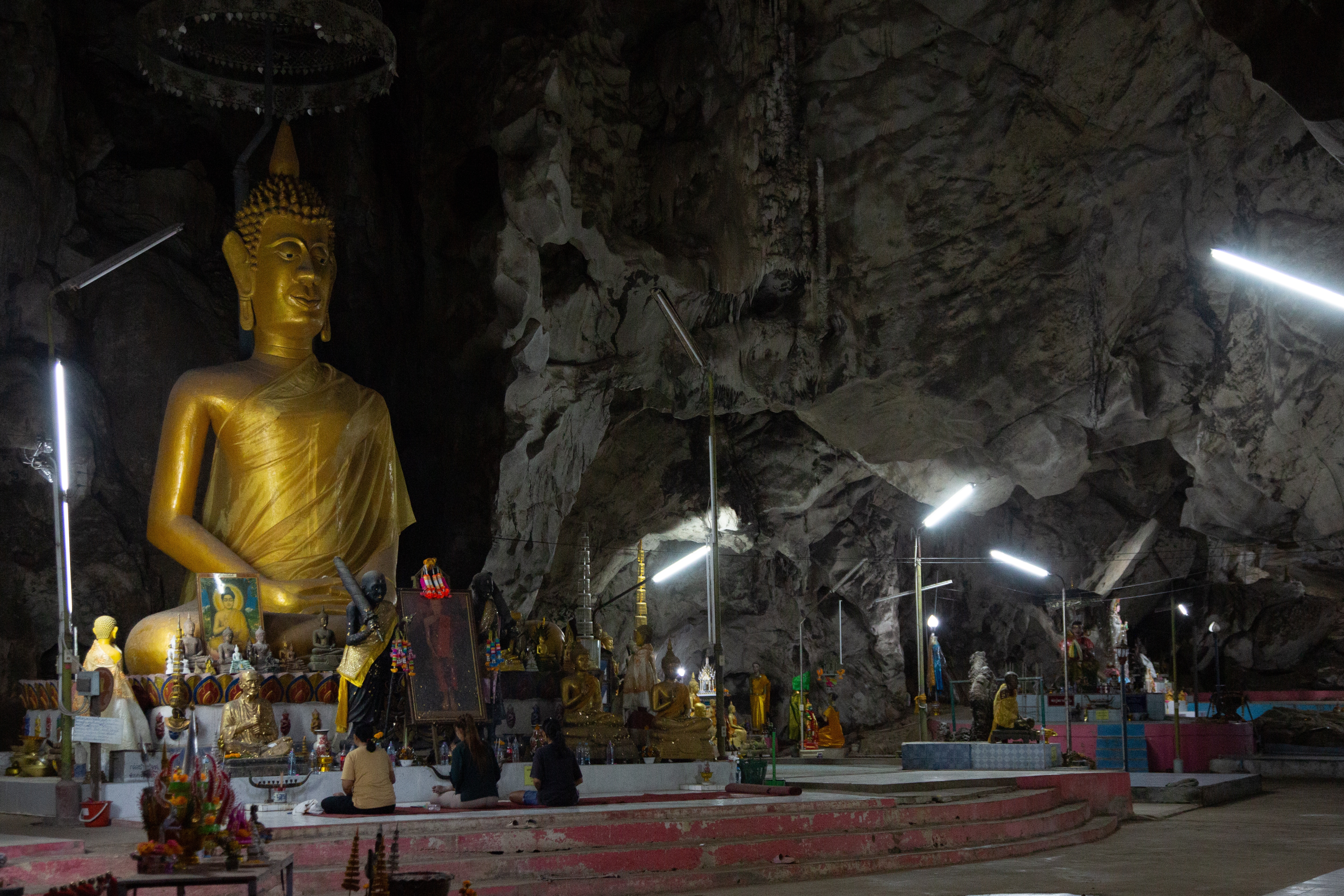 After a reasonable night’s sleep at the Hop Inn (very much like our Travel Lodges) we went to a mall very close to the hotel for breakfast. At this stage I have to say that the area we were in didn’t look too exciting. Directly across from the hotel was a theme park, not really for the mature traveller looking to experience the cultures of Thailand but fine for families. Next to the theme park was a grass park and lake where the locals would jog and exercise. We had a stroll so far round and decided it was too hot to walk far and decided to go back to the mall to get a tuk tuk to take us to a temple in a cave. The only available tuk tuk was a lovely elderly Thai gentleman that couldn’t speak a word of English and sadly we believe had difficulty reading. We used google translate but in the end showed him pictures of the temple on our phones. He offered to take us for THB300. We hadn’t realised how far this temple, Wat Tham Bo Ya was, almost 36 kilometres. If you have any aches or pains you may want to consider a taxi as this distance in a tuk tuk on a fast road is not the most comfortable mode of transport. Forget the movie Thelma and Louise by the time you arrive you are looking very wind swept. Unfortunately, or in this case fortunately, our wonderful driver managed to get lost, and we ended up in a remote Thai village in the middle of a jungle, a great experience as we were walking round while he asked every local, he could see where the temple was. Needless to say, we were several miles away. We hopped back into our not so luxurious tuk tuk and made our way to the correct area where he still had to stop several times asking locals if he was going in the right direction. We eventually arrived at the entrance of the temple grounds only to be faced with a very long steep staircase that leads to the entrance of the cave. Over 100 steps so if you have any disabilities that causes you problems with your legs you may want to give this temple a miss.